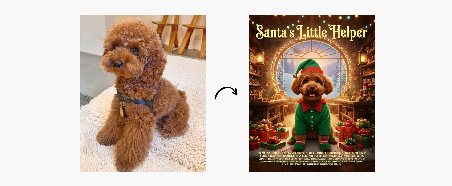 Once we receive your photos, we’ll design a custom cinematic poster using professional composition, lighting, and festive effects to make your pet look like a true movie star.